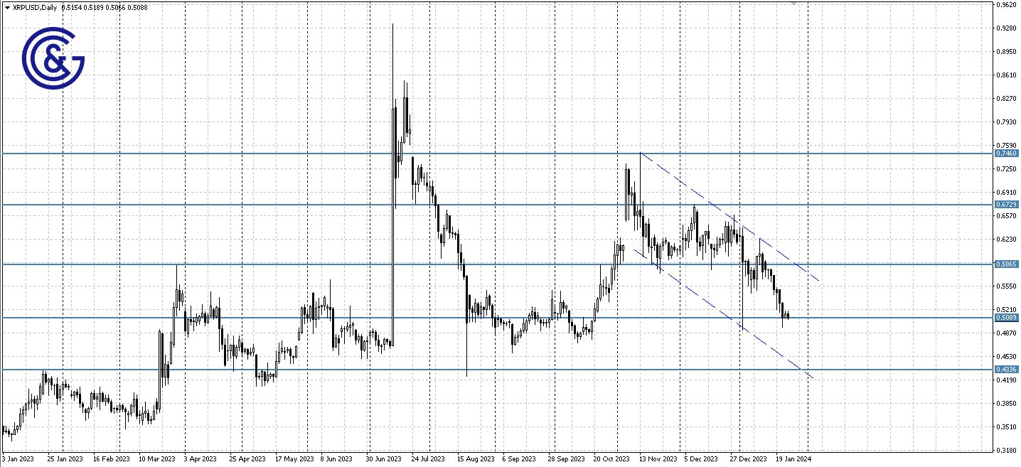 During its downward trend, Ripple reached support at 0.5089. A continuation southward within the channel could lead to further support at 0.4336. Conversely, an alternative scenario implies a recovery toward the resistance level of 0.5865.