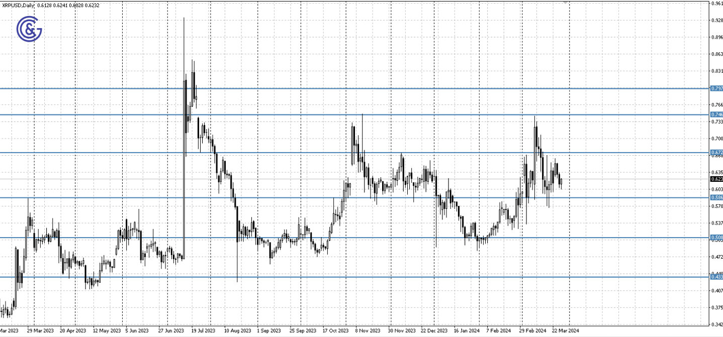 Ripple is experiencing a downturn within the range between 0.5865 and 0.6729 while maintaining a support margin. Should the price bounce back from the 0.5865 level, XRP/USD may see an upward turn. However, failure to hold this horizontal line could lead to the next support level at 0.5089.