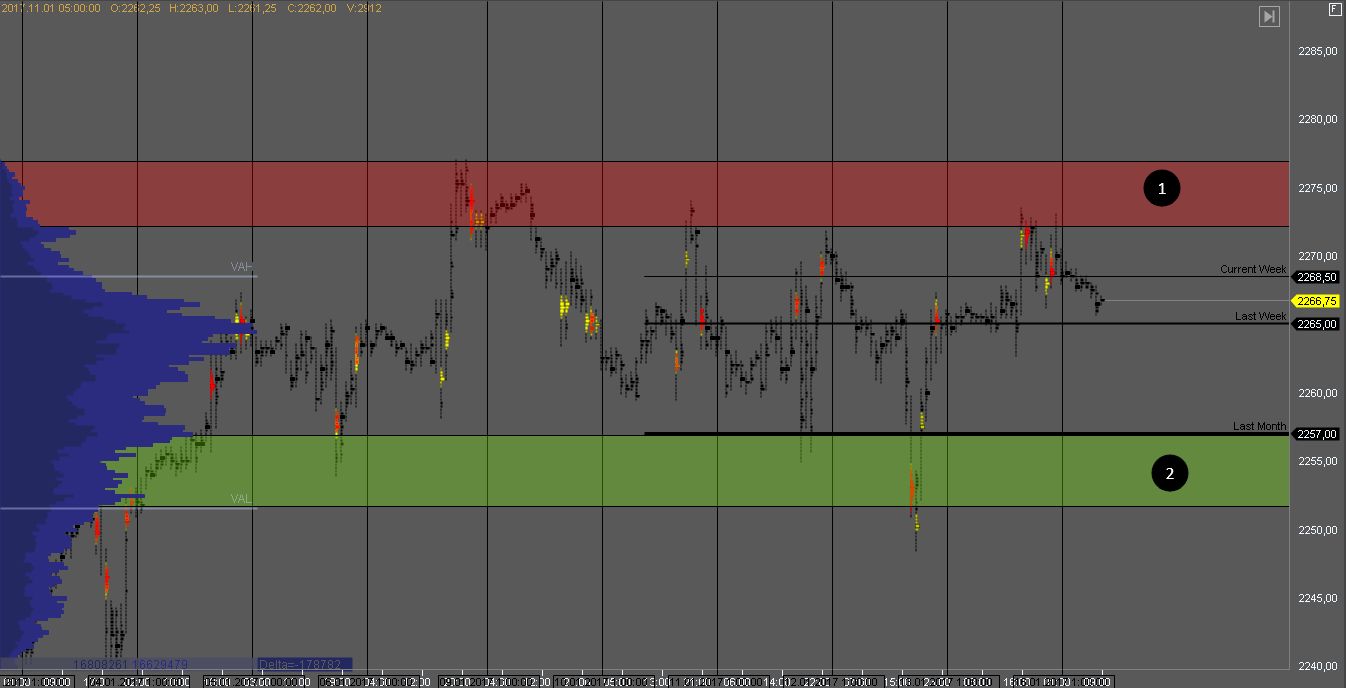 Продавец пытается продавить зону поддержки 1 и продолжить снижение к цели в зоне 4. В таком случае, можно будет рассматривать трендовые модели на продажу. Если покупатель удержит котировку выше зоны 1, покупки должны продолжиться к зоне 2, в которой находиться объем прошлого месяца. Пробив его, покупатель должен продолжить рост к зоне 3.